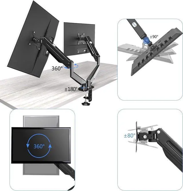 Full motion-The gas spring provides a smooth adjustment motion. Easy height adjustment, rotate 360°, tilt ±80° up and down, swivel ±180° left and right.