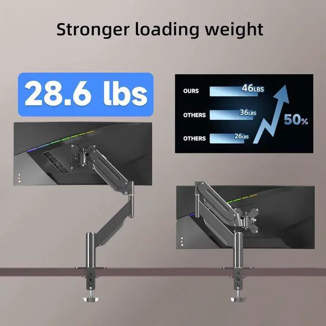 Full Range of Motion: 43 inch monitor arm mount features excellent flexibility and adjustability. It offers 20° to -10° tilt, 180° swivel, 360° rotation adjustment, height adjustable range from 8.26 " to 19.9 " and maximum arm extension to 18.7 ". You can customize an optimal ergonomic posture to meet a better gaming experience.