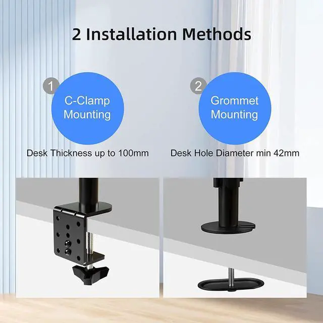 Two install options - C-clamp and optional grommet base (fits desk up to 4" thickness) save your valuable desk space.