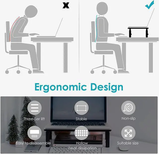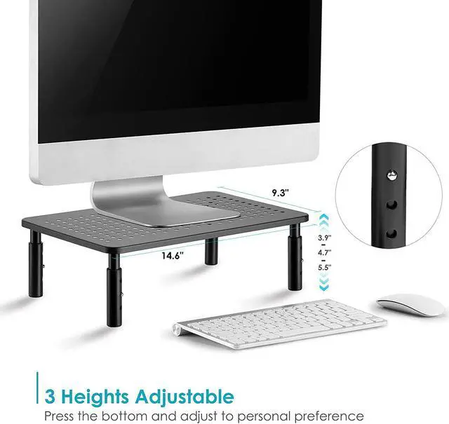 Ergonomic Design monitor riser with 3 Height Adjustments: This lightweight raise computer monitor Stand comes with 3 adjustable height levels allowing you to choose the most ergonomic, healthiest and most comfortable viewing angle while working. Simply press the button on the leg of the pc stand and lift the platform to adjust between the different height levels 3.9 / 4.7 / 5.5 inch to create a comfortable viewing position which help reduce stress on the neck and back.