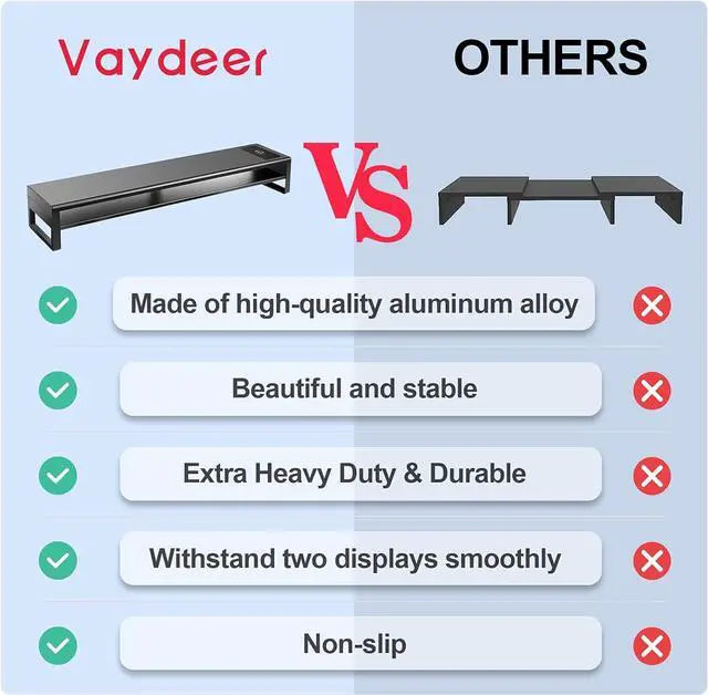 2 Tiers & Space SavingThis 2 tiers dual monitor stand adds extra space for tidying up a messy desk, providing an efficient and tidy working environment. The upper layer can store desktop accessories, such as cell phones, sticky notes and pen. It also sustain your monitor with a storage room underneath for keyboard and mouse.
