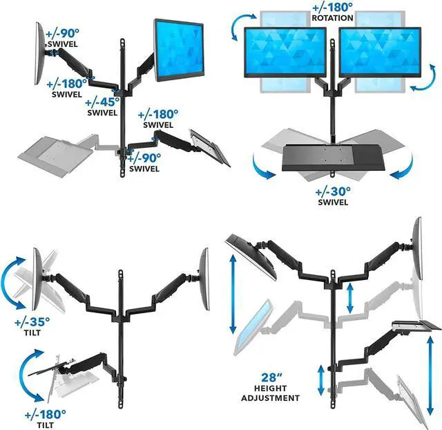 BONUS FEATURES: Keyboard tray comes with a soft wrist pad for added comfort. Cable management on the arms offer clean installation. Removable VESA heads allow easy installation of monitors and quick disconnect function. Wide range of height and angle adjustment at each arm ensure every user can adjust the screens and the keyboard to an ergonomic position.