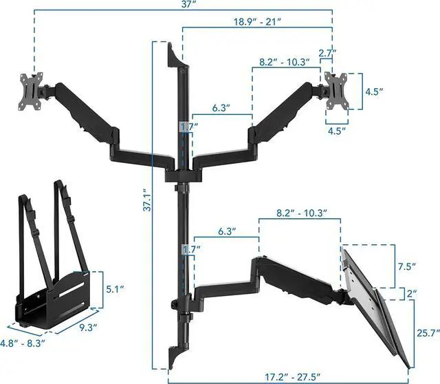 HEAVY DUTY CONSTRUCTION: Sturdy pole design with dual connection to the wall studs provides a secure base for the entire workstation. High-strength steel offers 17.6 lbs capacity for each monitor and 22 lb capacity for the CPU mount.