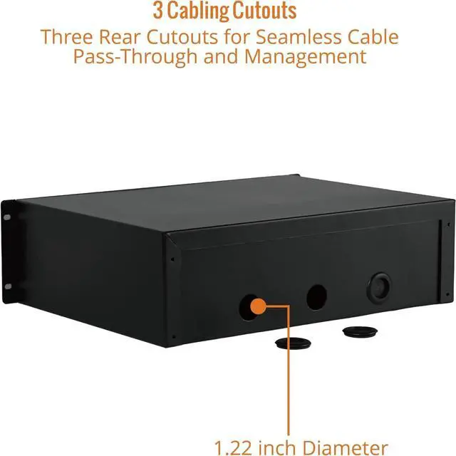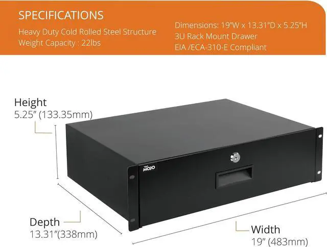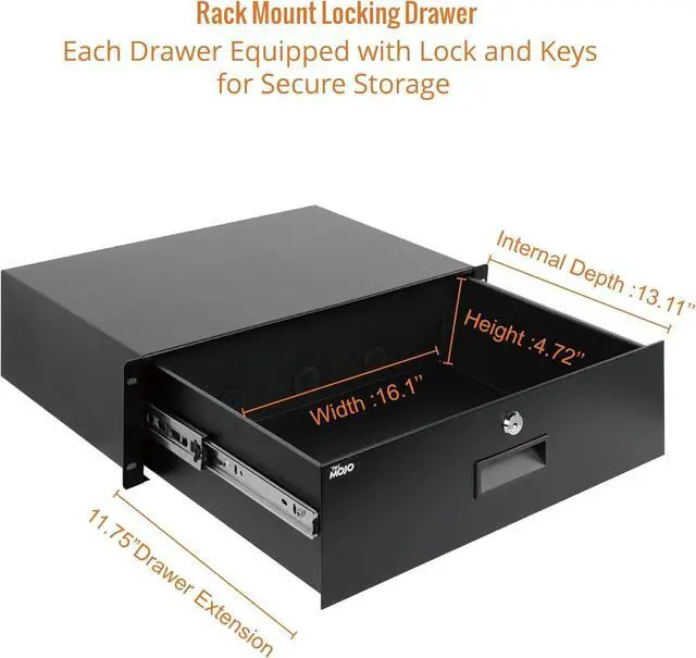 Durability: 3U Rack Drawer made from heavy gauge Cold Rolled Steel, Electrostatic powder coat preventing rust and corrosion; 22lbs Load capacity; 13in inner depth