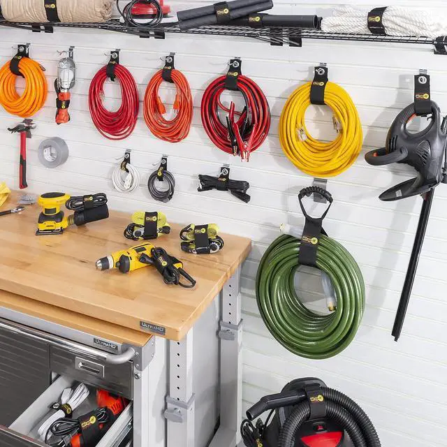 HEAVY-DUTY Storage Straps - Be honest, your garage cord storage could use an upgrade. Using a rusty nail as an extension cord holder was fine in your 20' s, but it' s time to step your game up. Our Heavy-Duty extension cord hanger is the perfect pegboard accessory for garage hook storage. Just wrap, strap, and hang your mess away.