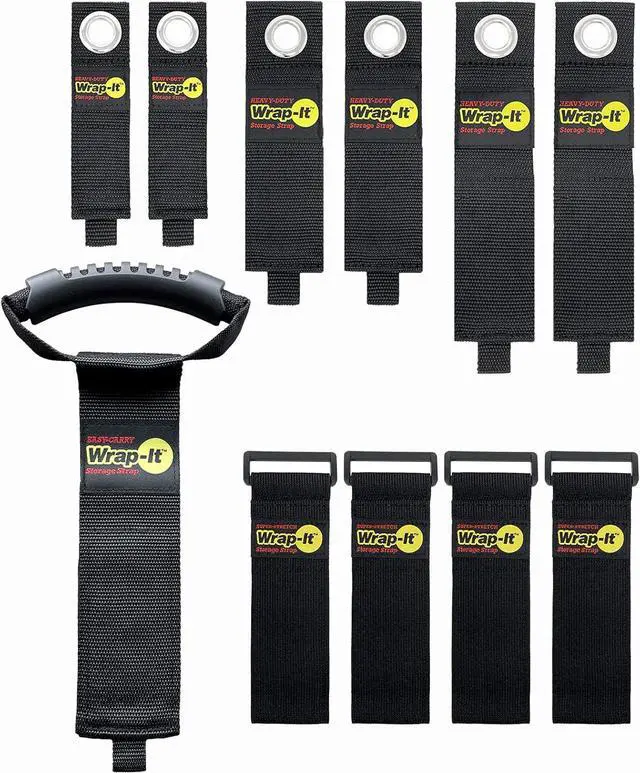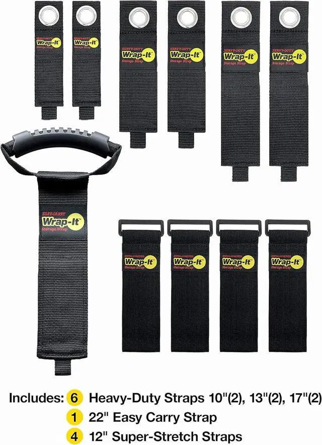 INCLUDES - (2) 10" Heavy-Duty, (2) 13" Heavy-Duty, (2) 17" Heavy-Duty, (1) 22" Easy-Carry, and (4) 12" Super-Stretch Wrap-It Storage straps. Makes a great gift for dad or anyone who loves organization!