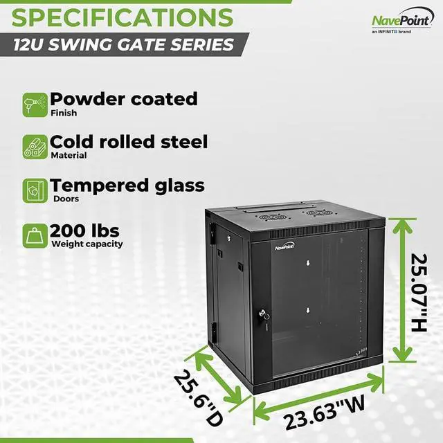 DURABLE - The 12U NavePoint Swing Gate Series network cabinet is constructed from robust cold-rolled steel, reinforced with a resilient black powder coating. Supporting a maximum weight of 200 lbs, it serves as a dependable solution for network and server equipment, perfect for long-lasting installations.