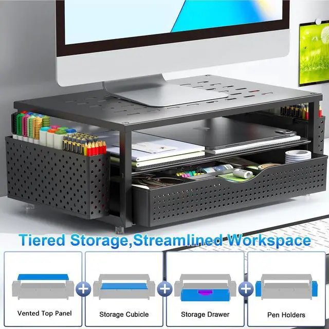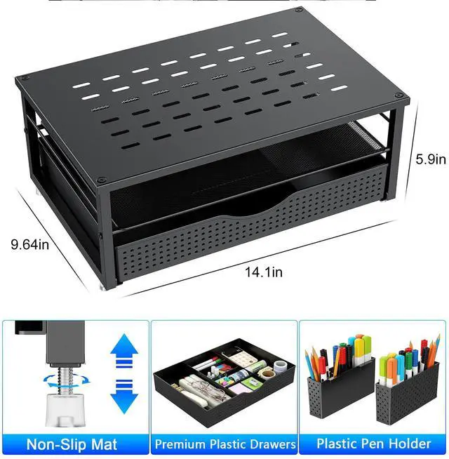 The display bracket elevates the display to a comfortable height to get a comfortable viewing experience to eliminate neck / back pain caused by incorrect viewing angles and improve work efficiency.