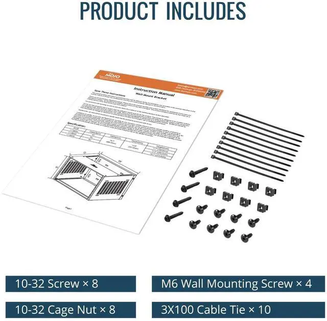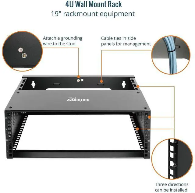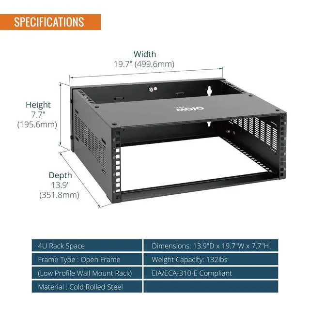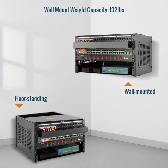 This Tecmojo server rack is construct from cold rolled steel, the structure has been optimized multiple times,resulting in a load-bearing capacity of up to 132lbs(60kg); Split structure, three sided square hole design,maximum mounting depth of 13.9 in,cables can be fixed on the side panel,this open frame server rack provide you with multiple choices,placed flat or mounted on the wall,capable of installing equipment from multiple angles,achieves effortless inspection, replacement and assemble.EIA/ECA-310-E Compliant;;Equipped with multiple accessories;with instructions or videos for reference;wall mount rack available in 4U, 6U, and 8U to choose,application for AV, network, NAS, DATA, server, router, switch, or power equipment,especially suit for office and studio,and good for Home Setup.