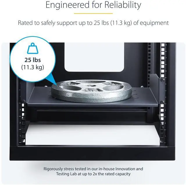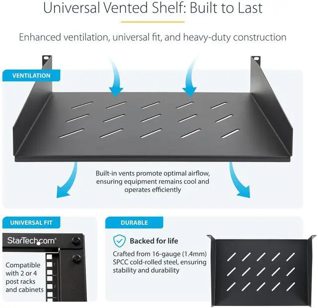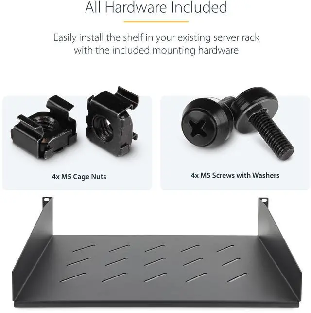 The fixed-rack shelf is made of 16-gauge (1.4mm) SPCC steel for long-term durability and sturdiness while supporting up to 25lb (11.3kg) of equipment. Accommodate server rack equipment, accessories, or non-mountable devices for ease of access and connectivity.