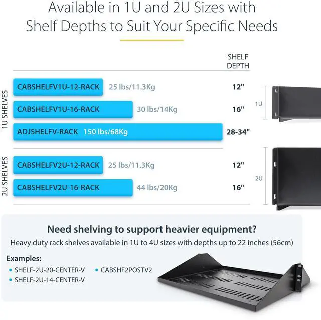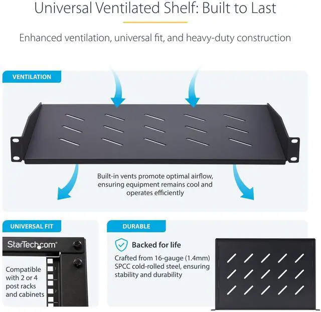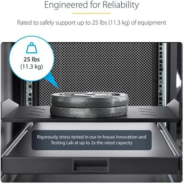 The fixed-rack shelf is made of 16-gauge (1.4mm) SPCC steel for long-term durability and rigidity while supporting up to 25lb (11.3kg) of equipment. Accommodate server rack equipment, accessories, or non-mountable devices for ease of access and connectivity.