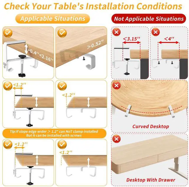It can be installed on glass, metal, and wooden desk.Drill-free clamp mounting is suitable for desks thicker than 0.4 inches, while screw mounting is suitable for desks thicker than 0.52 inches.