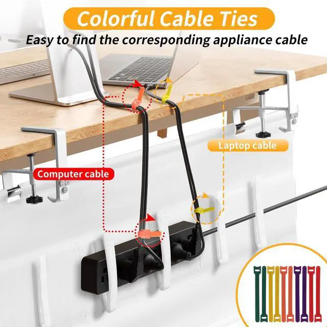 The colored hook and loop fasteners can keep the table tidy and make it easy to locate different cables.