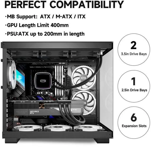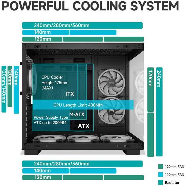 • ULTRA-LARGE CAPACITYSpace of CPS pc case is configured for each component ,will be fully compatible with your new computer components.ATX/M-ATX/ITX Motherboard Support 360MM Radiator Support CPU Cooler Height 175mm GPU Length Limit 400MM Power Supply Type ATX up to 200MM equipped with 2 × 2.5 " SSD and 2 × 3.5 " HDD installation Expansion Slots 6pcs I/O Ports:USB 3.1 Gen 2 Type-C,2 x USB 3.0,MIC & AUDIO,LED Swtich Button,Power Button