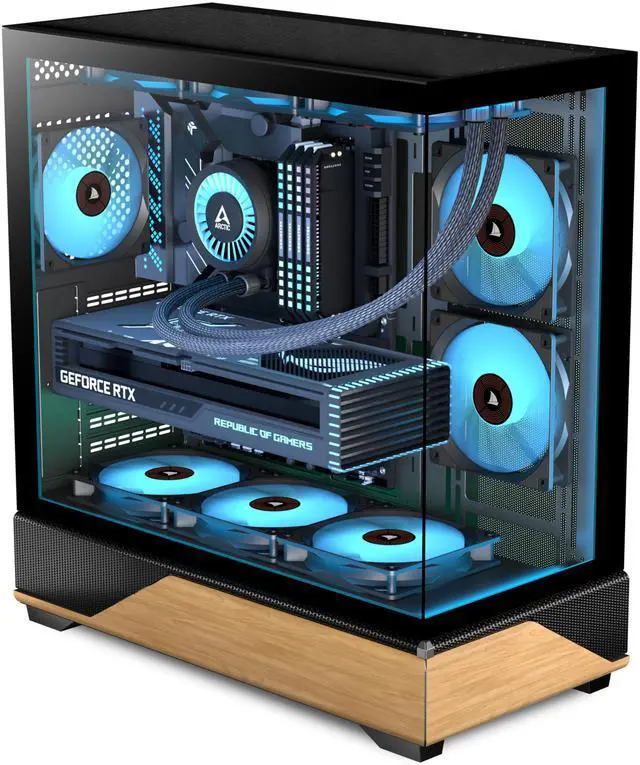 PC CASE ATX 5 PWM ARGB Fans Pre-Installed, Type-C Mid Tower Computer Case with Full-View Dual Tempered Glass, Printed Walnut Wood Panels, Support 360mm Radiator, Gaming PC Case, Black, new P6