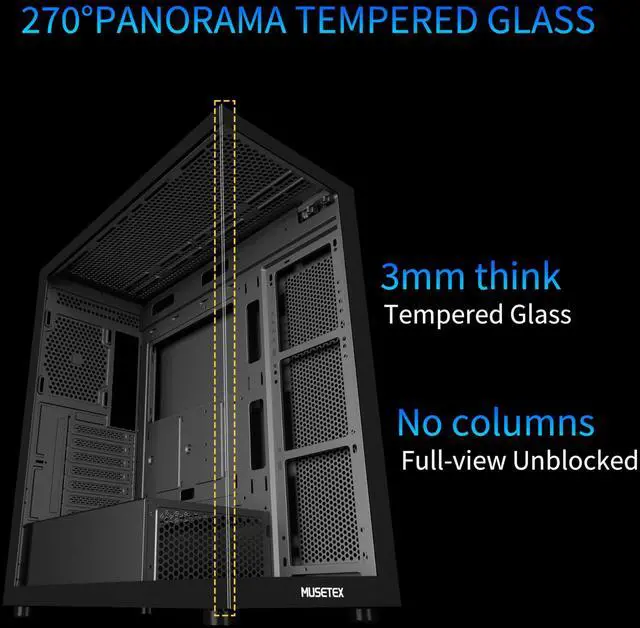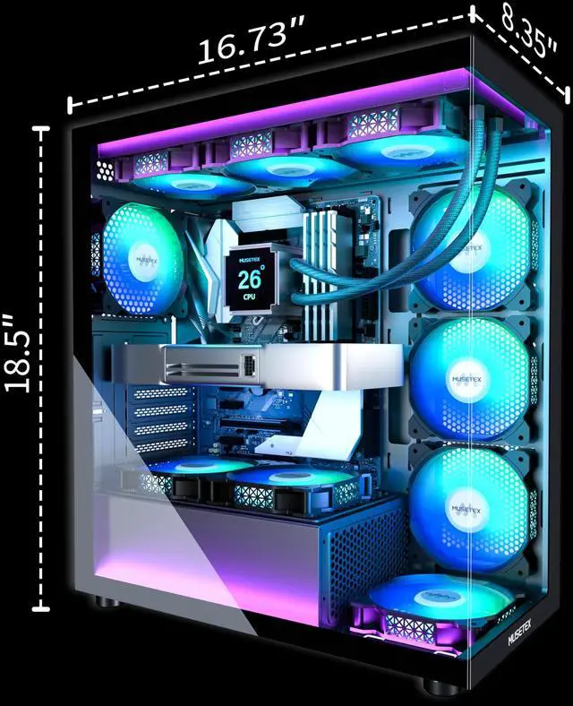 MUSETEX presents the K2 gaming pc caseboth a visual experience and a first-class installation experience,high configuration,high cost performance. Equipped with 7 pre-installed PWM ARGB fans and expandable to 10 total, it delivers exceptional cooling power to keep high-end hardware chilled during intense sessions. Featuring a 270° panoramic dual tempered glass design offering wider field of view than most similar cases, can display users' high-end and cool PC hardware and beloved dolls, and will gain friends' cool admiration