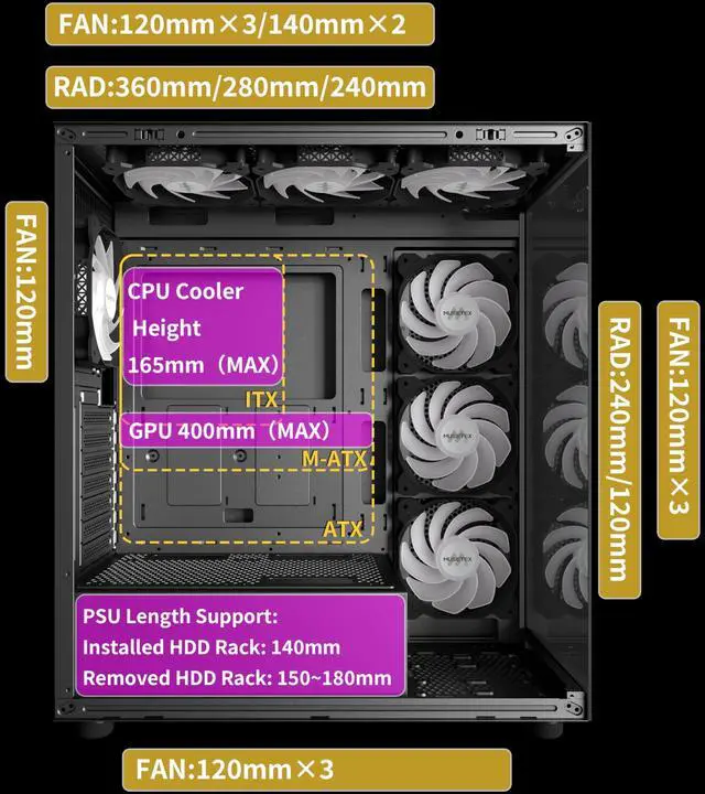 Tower Case Powerful Space LayoutThe internal structure of the MUSETEX ATX chassis is clearly partitioned, with each installation space thoughtfully arranged. It is compatible with most common hardware components on the market, supporting GPUs up to 400 mm (15.7") in length, CPU coolers up to 165 mm (6.5") in height, and top-mounted liquid coolers up to 360 mm (14.2"). It supports power supply units up to 140 mm (5.5") in length when the hard drive cage is installed, and up to 150180 mm (5.97.1") in length without the hard drive cage