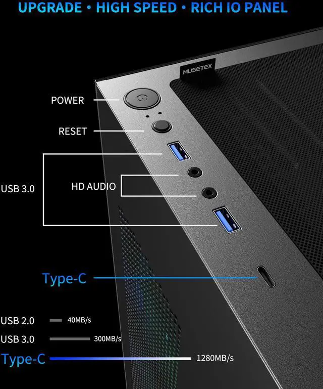 Upgrade High Speed IO Panel1 x Type-C, 2 x USB 3.0, Microphone & Audio, Power Button, Restart Button