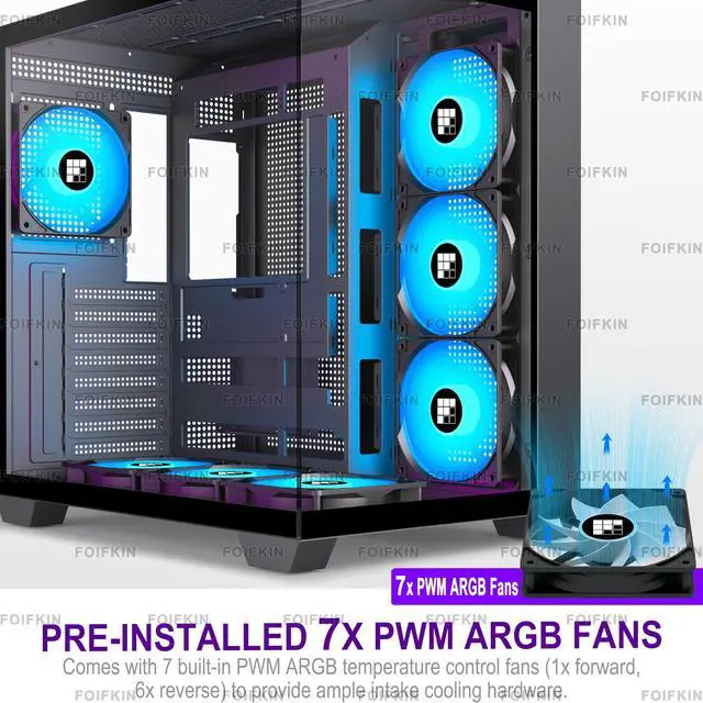 F600 PC Case - Pre-Installed 7 PWM ARGB Fan, ATX Mid-Tower Gaming PC Case, 270° Panoramic Glass with Type-C, FOIFKIN (Black, F600)