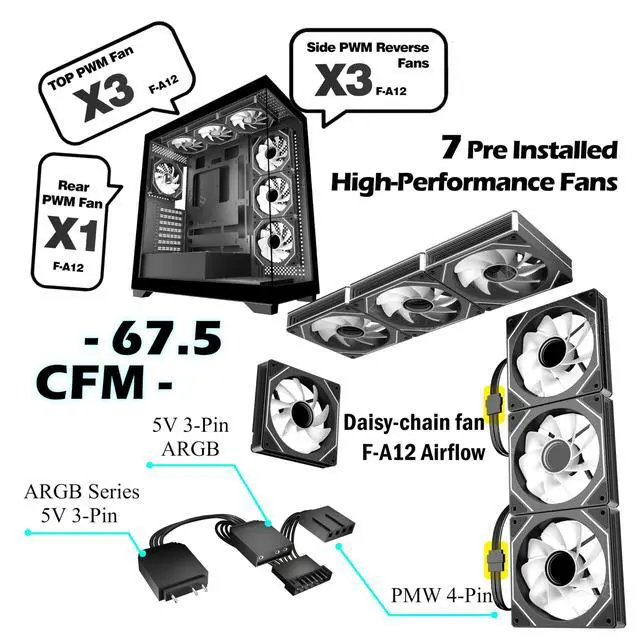 [7 High-Performance Fans]C9 pre-installed 3*reverse fans on the sidereverse blade fan design is not only beautiful but also help the mid tower pc case absorb air cooling,3*exhaust fans on the top and 1*exhaust fan at the rear to quickly remove heat,cooling PC componentsfeaturing a daisy-chain design and 1-to-3 splitter for neat,simplified cable management.with motherboard synchronized lighting effects.