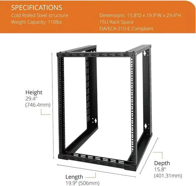 Sturdy: Open Frame Server Rack made from Cold Rolled Steel; Rear brackets enhance stability; Weight capacity of 110lbs; Electrostatic powder coat preventing rust and corrosion