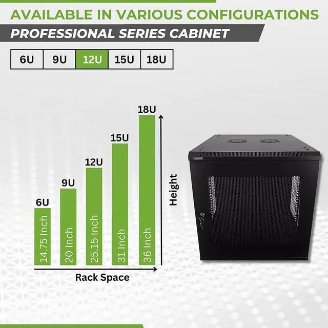 USER-FRIENDLY CUSTOMIZATION - The 12U data cabinet features adjustable vertical mounting rails in 7/8" increments, accommodating switches, patch panels, and equipment up to 14.5 " deep. It' s a user-friendly option that enables installers to easily set up and customize server environments to meet specific project needs.