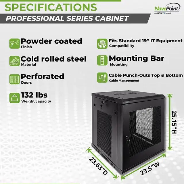 DURABLE - Crafted from cold-rolled steel with a protective black powder coating, the 12U NavePoint Professional Series network cabinet provides a sturdy, reliable housing for network and server equipment. Capable of supporting up to 132 lbs, it' s an ideal, durable solution for installers working on long-term projects.