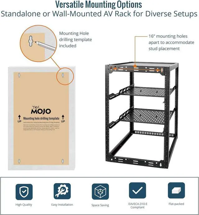 Effortless Setup Network Rack includes hardware, a comprehensive manual, mounting hole drilling template and an online assembly video to simplify setup