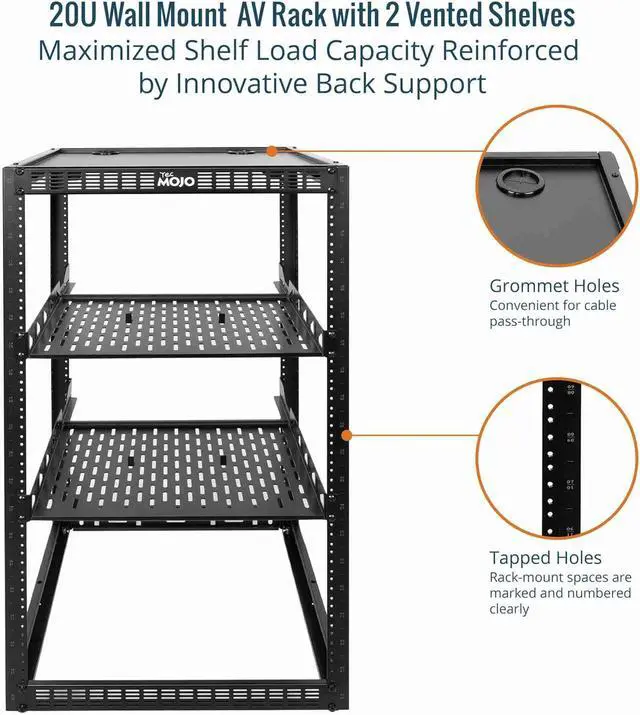 Complete Accessories A 20U open frame server rack, two ventilated shelves, four shelf stops, four velcro straps and a set of equipment mounting screws
