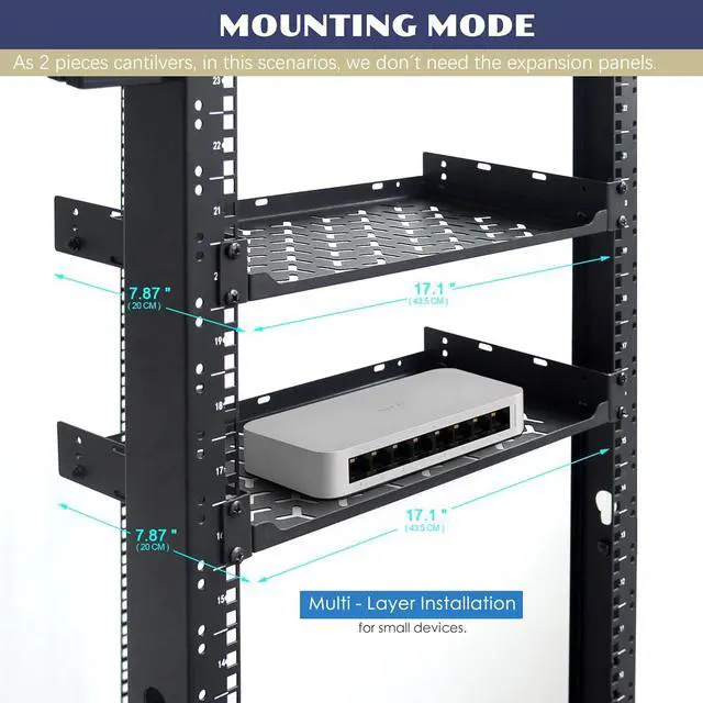 Flexible Combo Design: Includes 2pcs rack shelves and joint brackets, enabling individual cantilever mounting or combining the two small cantilever shelves via brackets into a full-size shelf (19" W x 19.7 " 29.7 " D x 1.77 " H) to adapt to diverse storage needs.