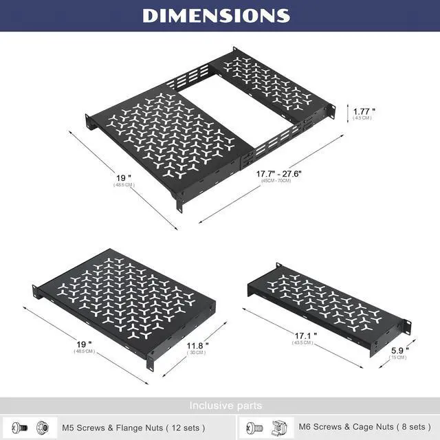 Flexible Combo Design: Includes 2pcs rack shelves and joint brackets, enabling individual cantilever mounting or combining the two small cantilever shelves via brackets into a full-size shelf (19" W x 17.7 " 27.6 " D x 1.77 " H) to adapt to diverse storage needs.
