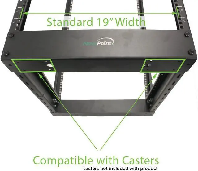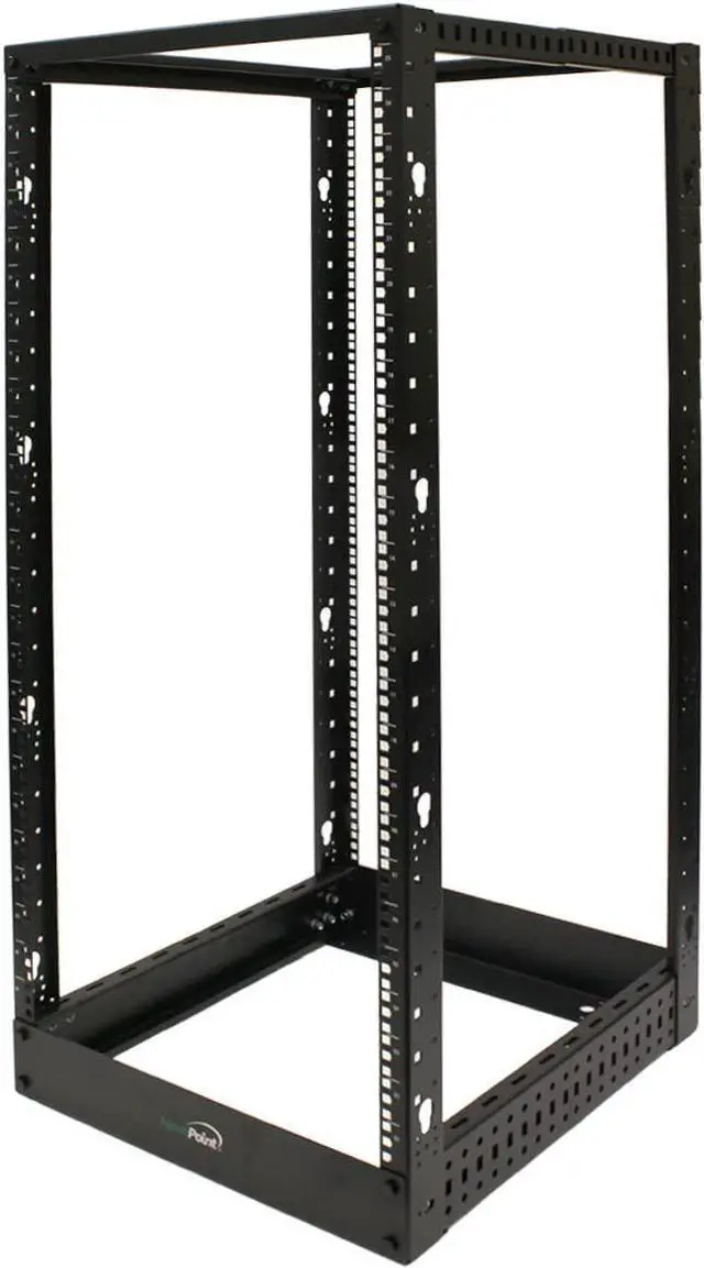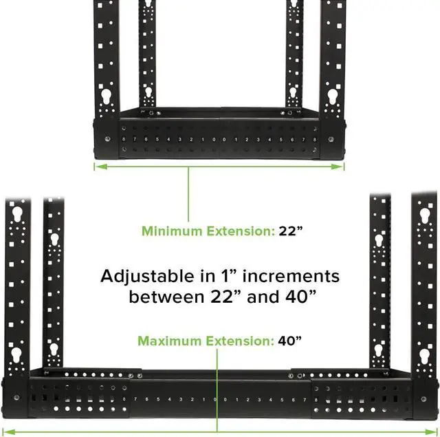 4-post Open Frame Rack Floor mount (compatible with casters) Supports standard 19" rack mount equipment 49.45 " H x 52.5 " W x 57- 103.3 " D Rack Depth: 22" - 40" (adjusts in 1" increments)