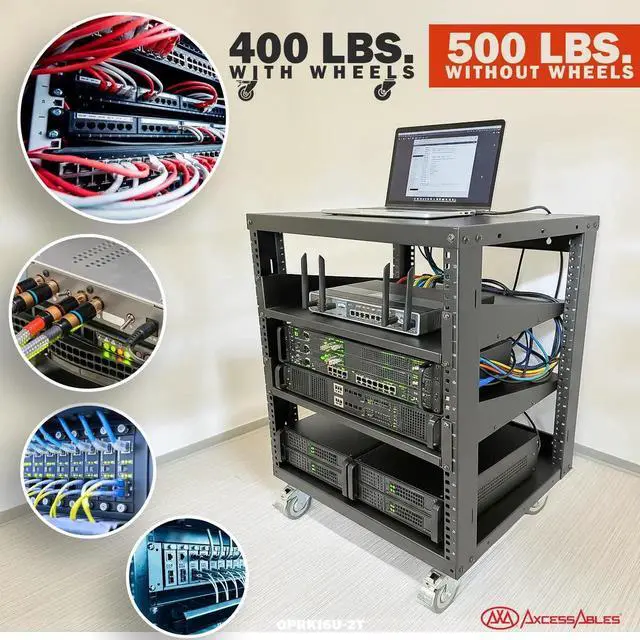 AxcessAbles 12U Open Frame Network & AV Rack with Caster Wheels, Two 2U Shelves, 10-32 & Cage Nut Compatible Rails, Cage Nuts, Screws, Cage Nut Tool & Wall Mount Kit ^^ 19-Inch Rack