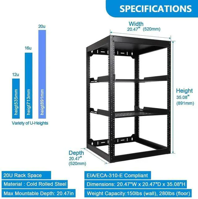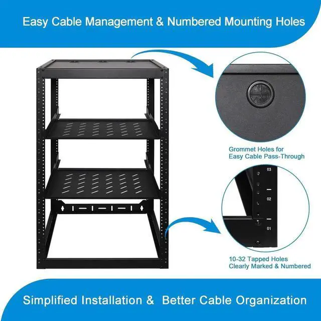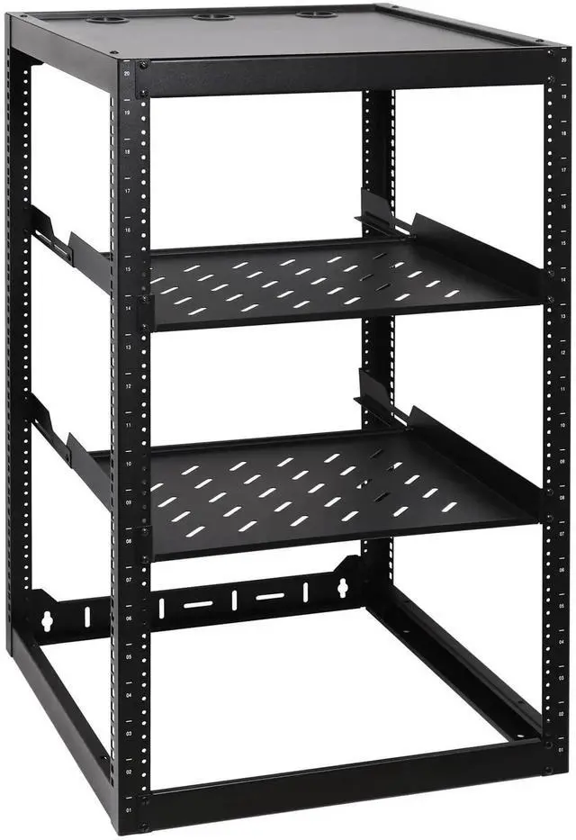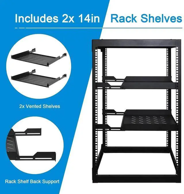 Maximize your network setup with the RackPath Open Frame Server Rack a versatile and durable solution for organizing your IT, AV, or telecom equipment. Built with premium cold-rolled steel and finished with a sleek black powder coating, this open frame rack offers both wall-mounted and floor-standing installation, adapting seamlessly to home labs, server rooms, or office closets. The included accessories 2× 1U vented shelves, a full set of 10-32 screws plus wall mounting screws ensure you're ready to mount switches, patch panels, modems, DVRs, or routers right out of the box.