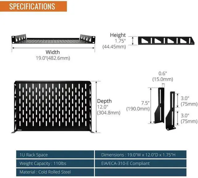 Tecmojo 1U Rack Shelf, 19 inch Rack Shelf 12 inch Depth, Rack Mount Shelf with Anti-Slip Stops, Server Rack Shelf and Network Shelf for 19 in Equipments, 110lbs Capacity of Vented 1U Shelf, No Lip (2 Pack)