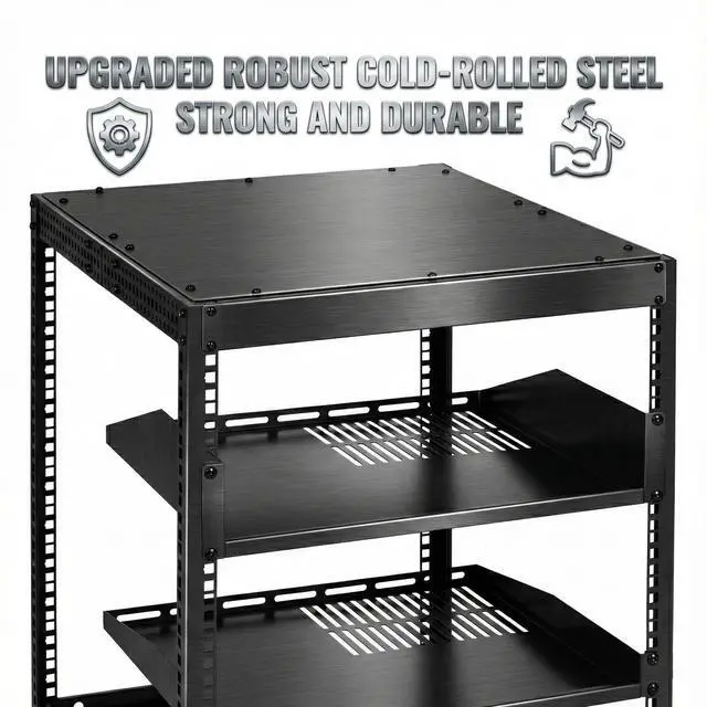This versatile 12U 4-post open frame rack is designed for the secure and organized storage of network, server, and AV equipment. Its robust cold-rolled steel construction ensures exceptional durability and a high maximum load capacity of up to 300 lbs.