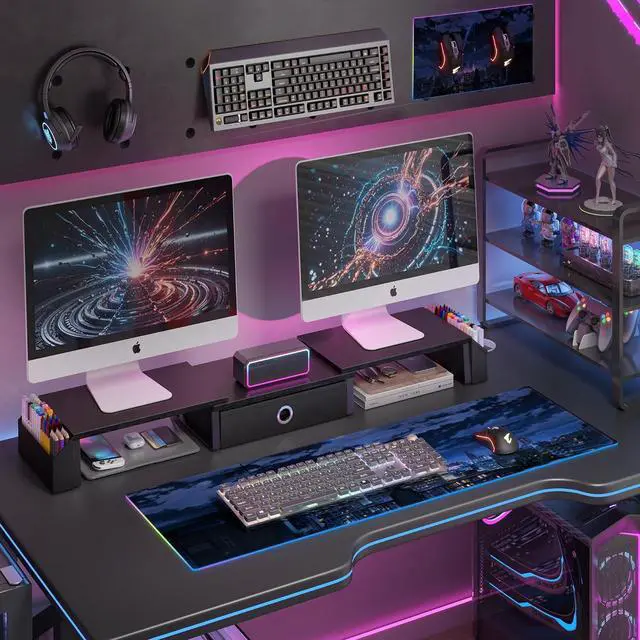 Large Storage SpaceMonitor riser for 2 monitors comes with a sliding drawer and two side caddies, which provide more storage space for your desk. The drawer could store personal items in privacy. One side caddies has divider that could store small office items, and the other side caddies is large enough to store file. Dual monitor stand with storage used as desk organizer to offer more comfortable office environment.