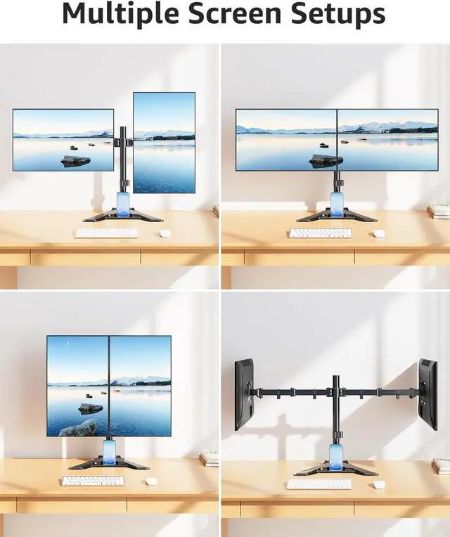 • Multifunctional Monitor Stand- This Dual monitor arm could rotate 360 degrees for landscape or portrait orientation. Swivel 180 degrees to share your display. Tilt +70° to -90° degrees for better viewing. It's easy to find the right viewing angle and position.