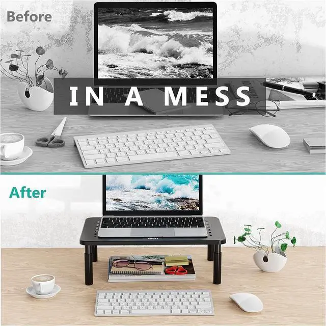 Ergonomic: The height-adjustable monitor riser can raise a computer monitor, notebook, or any device by 3.9 inches, 4.7 inches, or 5.5 inches off the desk to create a comfortable viewing position and a healthier sitting position which helps reduce stress on the neck and back