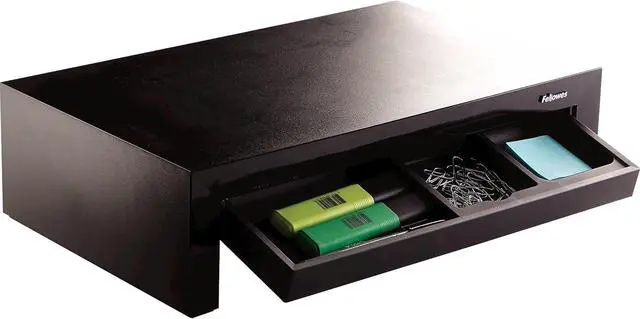 Raises monitor to comfortable viewing height and maximizes workspace