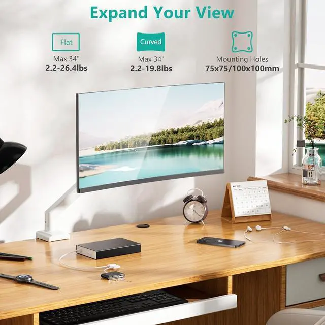 Compatibility: Single monitor arm fit most flat or curved LCD/LED screen from 17 to 32 in, support up to 19.8 lbs with 75x75mm, 100x100mm mounting holes. The two-stage locking system is applicable to 0.4 - 3.3 thick desk for both C-clamp and Grommet Base