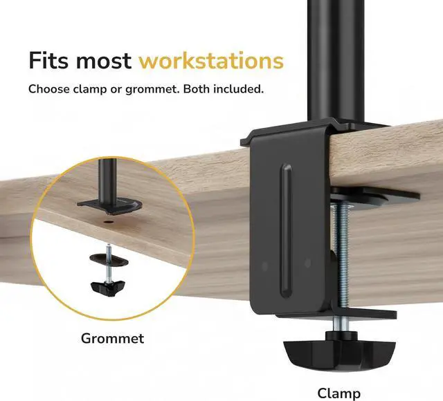 Fits most desks Choose between a C-clamp ( 0.39 " 3.3 " thick desktops) or grommet base ( 0.39 " 1.6 " ). Designed for single-stud or solid wood/concrete surfaces (not drywall-only).