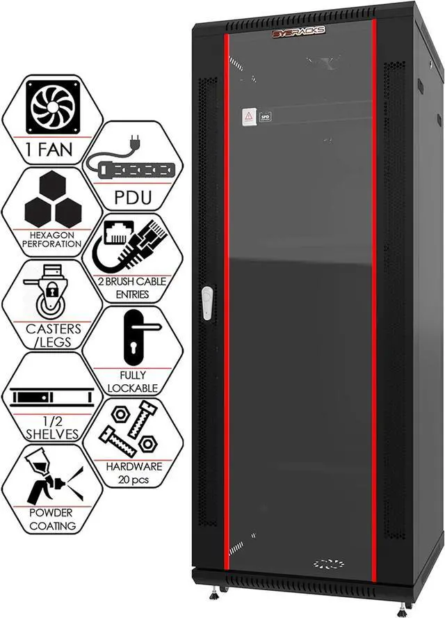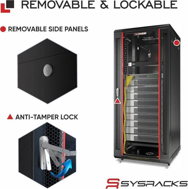• LOCKING GLASS DOOR & REMOVABLE PANELS Tempered glass front door with perforated airflow design provides visibility and protection, while removable side panels allow quick equipment access and secure installation.