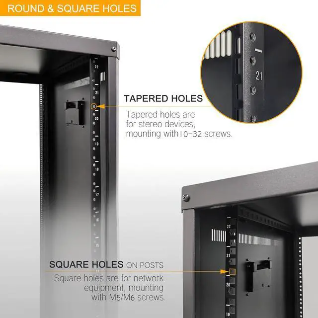 OPTIONAL RAIL HOLES & ADJUSTABLE DEPTH: This free-standing cabinet has front and rear rails. The unique design is with both tapered & square holes on each rail: round holes are compatible with US 5 mm and European 6 mm standardswhile square holes fit M6 & M5 screws & cage nuts. We can also by moving rails forward or backward to fit devices depth