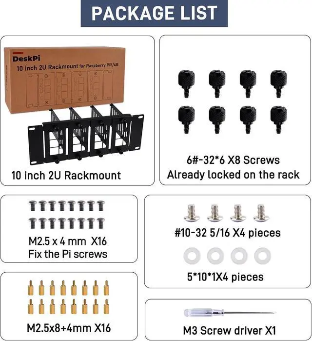 The rack mount with 10 inch 2U standard size is suitable for DeskPi RackMate T0/T1/T2/T0 Plus/T1 Plus/TL1 Server Cabinets and other 10 inch Server Cabinets.
