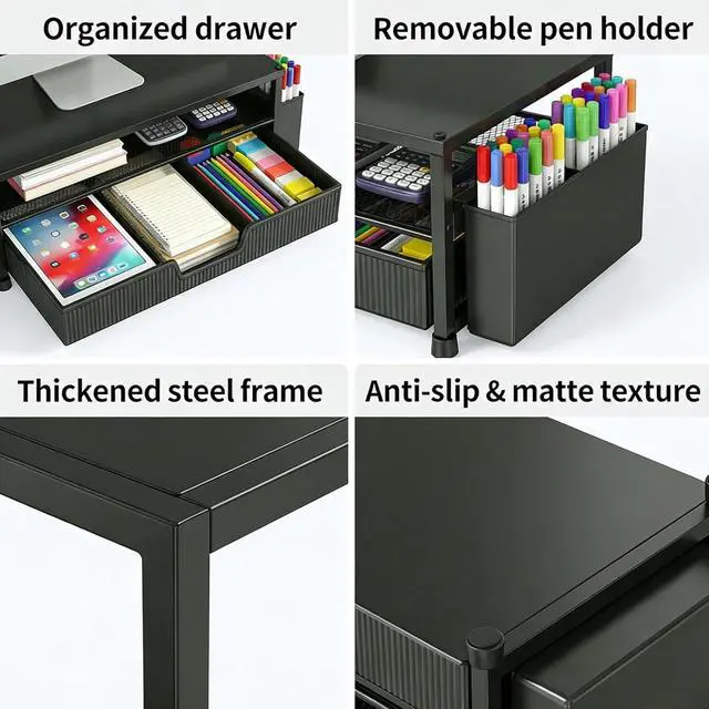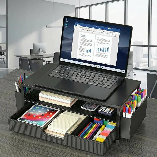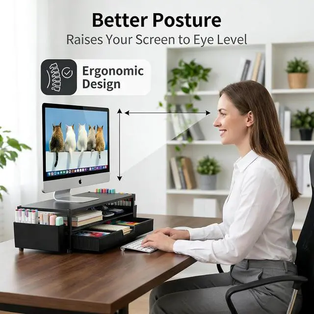 Ergonomic Eye-Level Comfort Elevate your screen to the perfect eye level to eliminate neck strain and slouching. ECOLOVI desk organizer monitor stand promotes a healthier posture, reducing fatigue during long hours of work or studying, so you can stay focused and productive all day