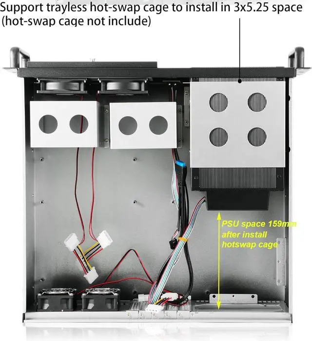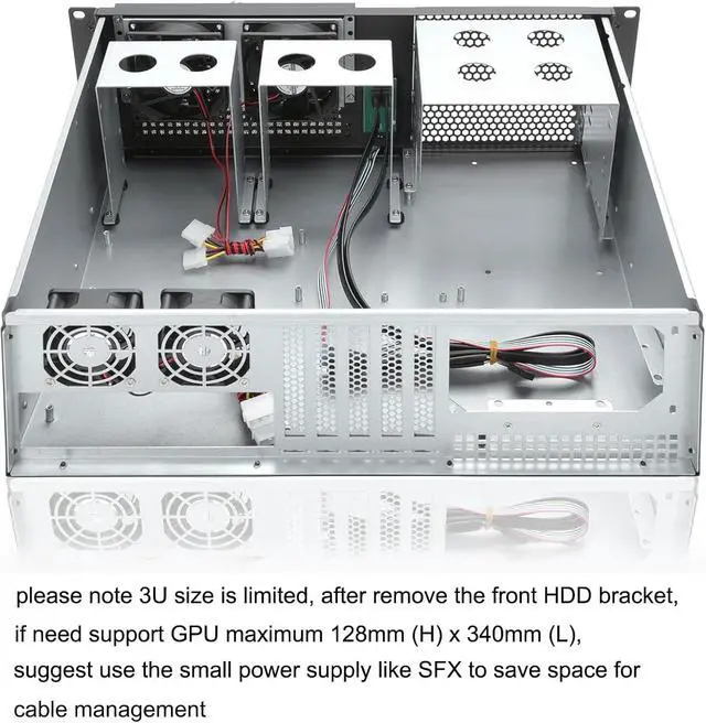 About GPU If remove a HDD cage max support 320mm to 340mm if donot remove the HDD cage, max support 240mm to 260mm please note 3U size is limited, please use the small power supply like SFX PSU to save space for cable management