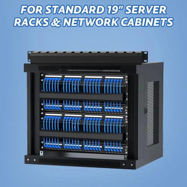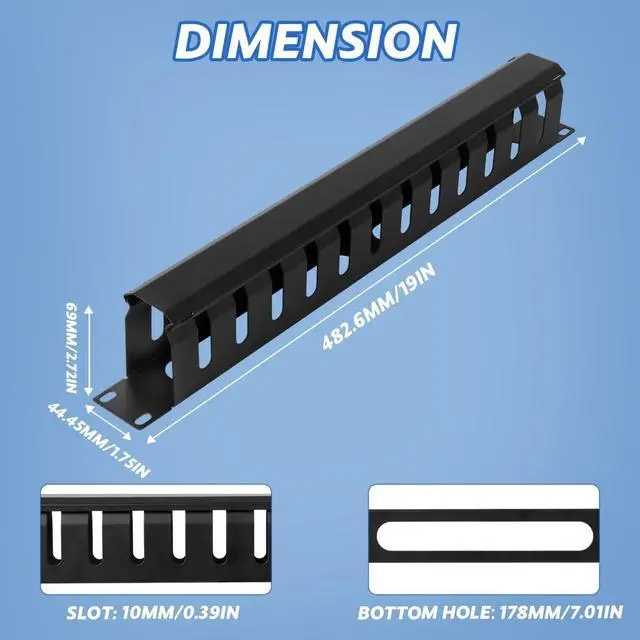 1U Cable Management RackThis cable raceway kit includes 2 pcs 19" (W) X 2.72 " (D) X 1.75 " (H) cable raceways, 8 pcs M6 screws and cage nuts. The cable raceway black has 12 slots, each slot is 0.39 " wide. This wire raceway is easy to install and suitable for standard 19" server racks and network cabinets.