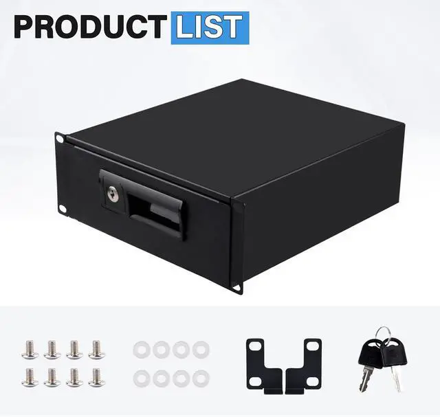 Package includes 1x 10 inch 2U rack mount drawer, 2x side lugs, 8x Screws, 8x Washers, 2x Keys