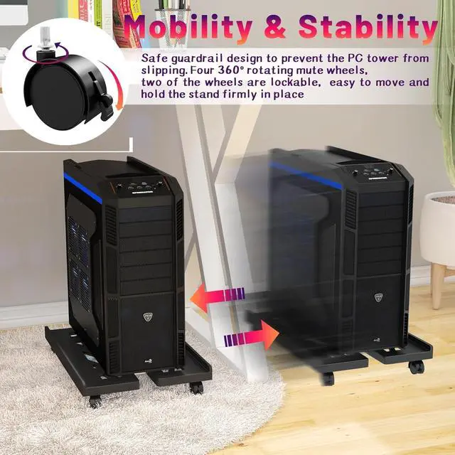 C. Free Mobility The tower stand can be moved in all directions to be placed where you want, you can use it at home and office freely, it is with 4 universal rolling wheels, two of them is lockable casters, it is better to install them at the same side of the front, it is more easy to move under your computer desk and stay in place, pc tower stand.